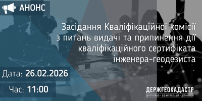 Кваліфікаційна комісія з питань видачі та припинення дії кваліфікаційного сертифіката інженера-землевпорядника повідомляє адресатів, сертифікованих інженерів-землевпорядників та заінтересованих осіб про їх право на участь у засіданні яке відбудеться 26 лютого 2026 року о 13.00 за адресою: вул. Святослава Хороброго, 3, м. Київ.